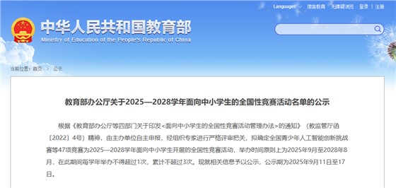 白名单竞赛举办时间原则上为2025年9月至2028年8月,在此期间每学年举办不得超过1次,累计不超过3次。公示期为2025年9月11日至17日。